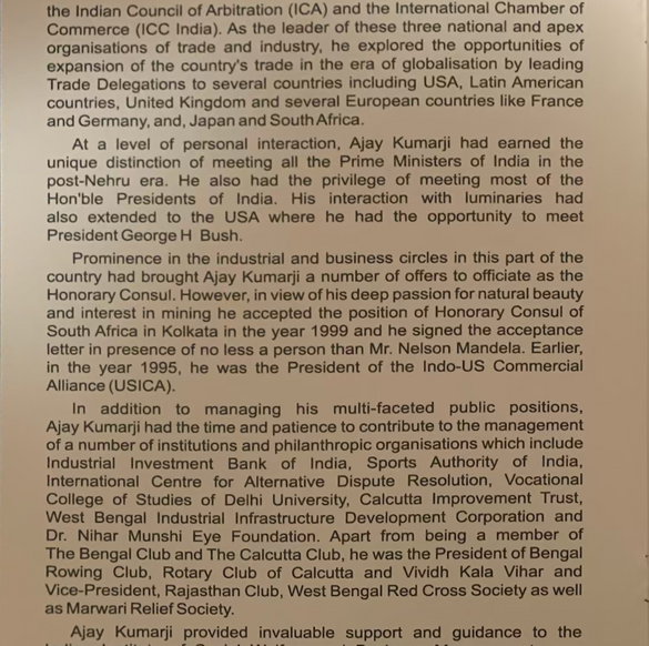 On March 9th 2015, leaders from government, industry and the diplomatic corps gathered at the Taj Bengal to honour Ajay Kumar Rungta’s lifelong contributions. Below you can listen to – and read – the full tribute, explore the original programme, and browse rare photos that span his remarkable life.